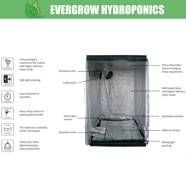 Clearance EverGrow Hydroponics Indoor Grow Tent 2x2m, 2.4x2.4m, 3x2, 3x3m Mylar 600D