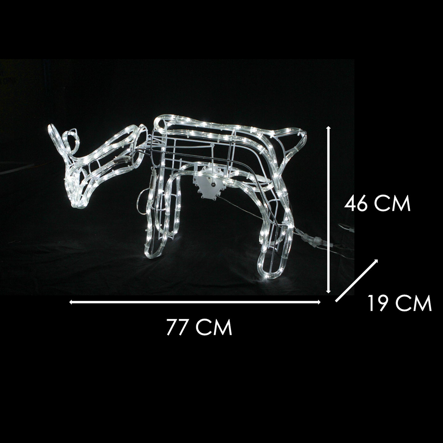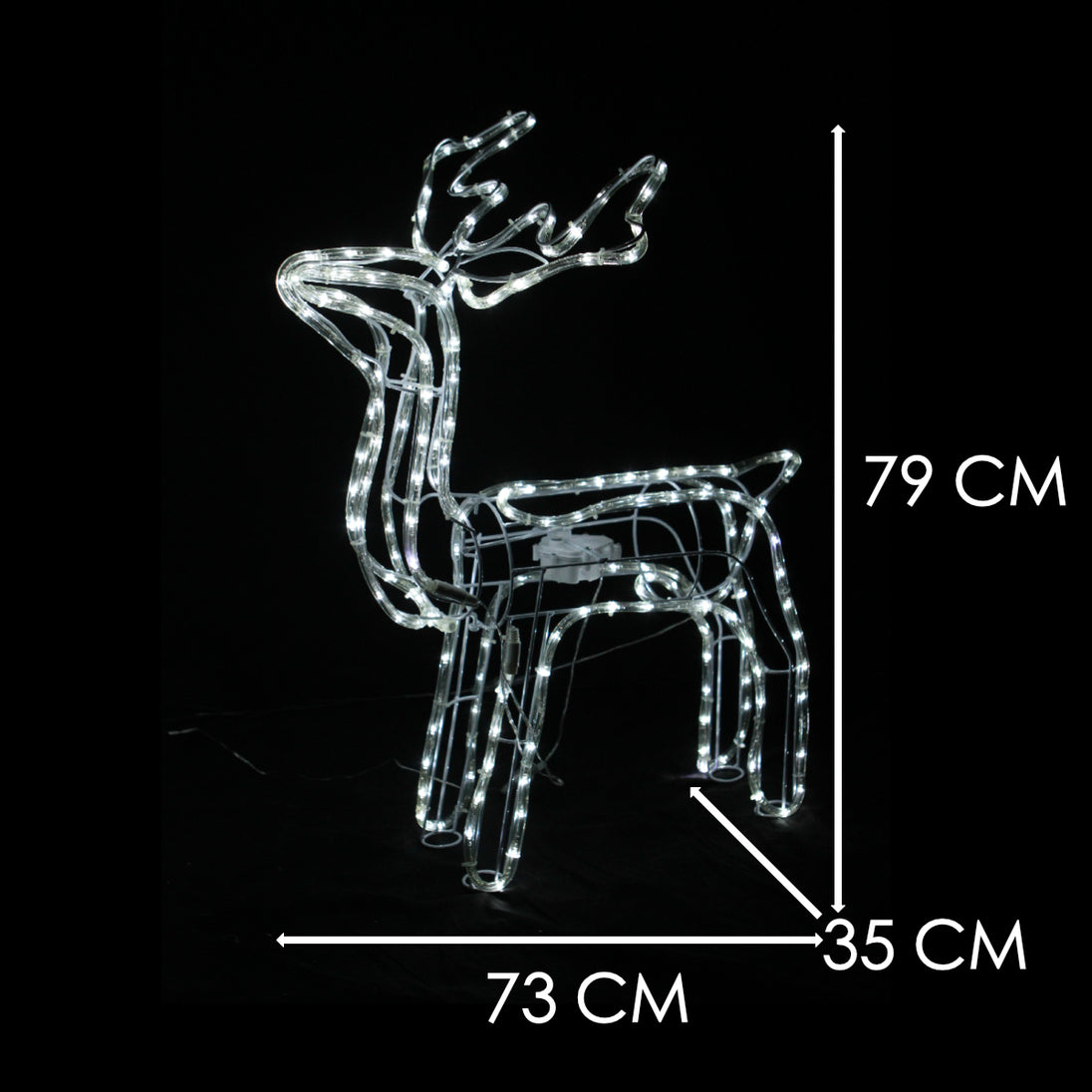 Spice up your Christmas spirit by decorating the home front with this gorgeous looking reindeer family set. Both Buck and Doe are featured with motorised moving head. The Buck measures approx. 73x79x35cm, the Doe measures approx. 77x46x19cm and the mini measures 43x34x12cm (mini is not motorised). The outline is in cool white rope light with a total of 504 LED count.