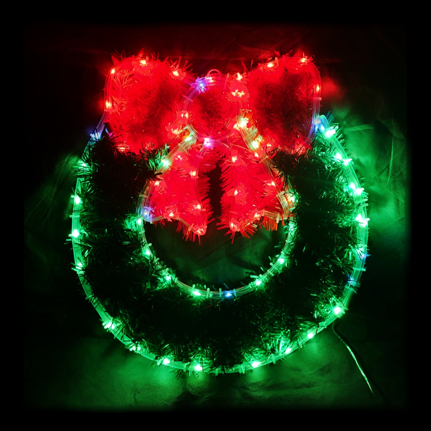 Decorate and celebrate this year's Christmas and New Year with this classic red & green PVC tinsel filled wreath motif display sign. Comes with twinkling LEDs.