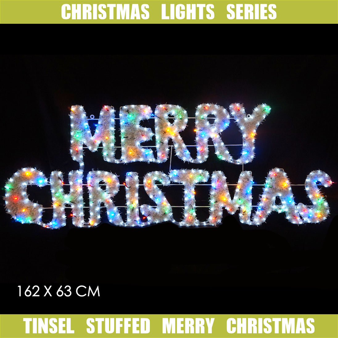 Decorate and celebrate this year's Christmas and New Year with this beautiful bold letter Merry Christmas display in white tinsel and colour LEDs.