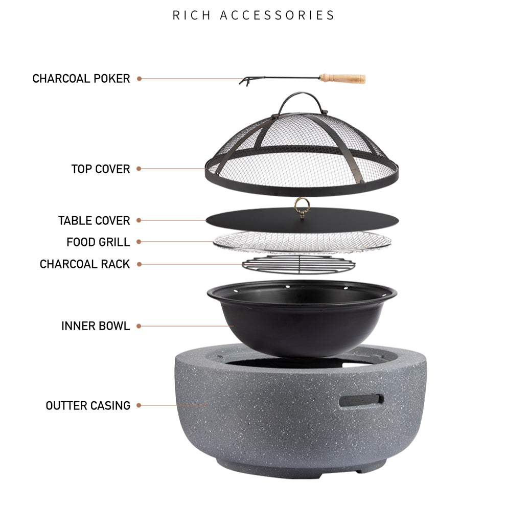 - Accessories Includes - Top cover, table cover, food mesh grill, charcoal rack, charcoal poker