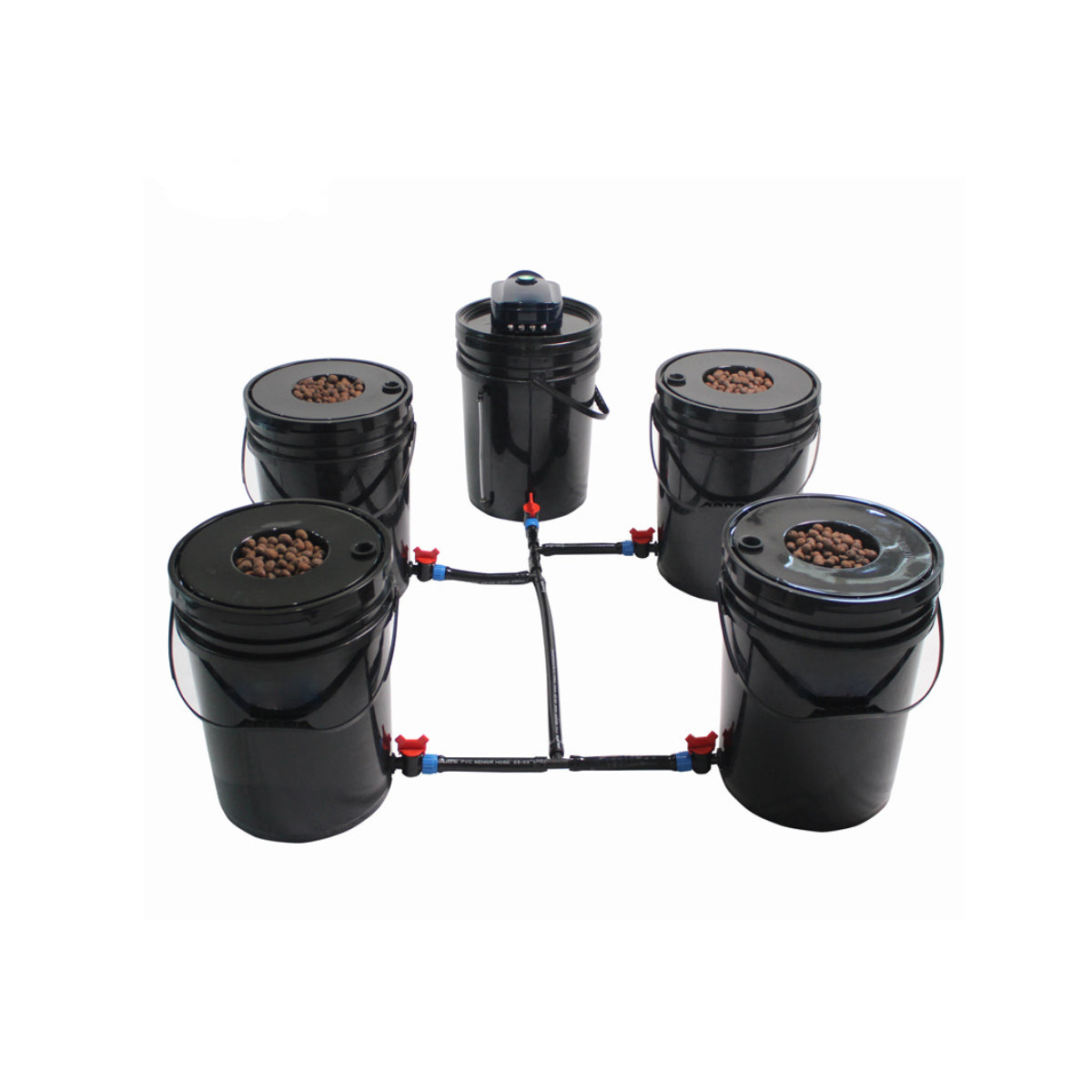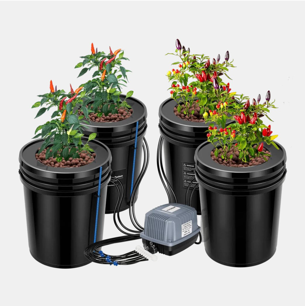 DWC (Deep Water Culture) kit helps plants to grow their roots immersed in aerated nutrient solution for faster growth. The main bucket distributes the nutrient solution to the connected buckets and with the aid of the air pump, the solution stays oxygenated and stirred. EverGrow's DWC kit can be used inside a grow tent.